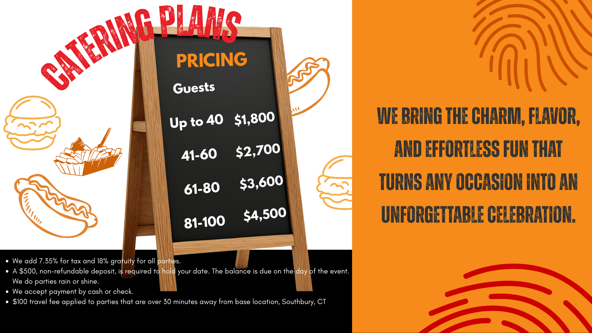Let us cater your next event! Whether it’s hot dogs, chicken sandwiches or both, we bring fun and flavor. See below for our pricing!